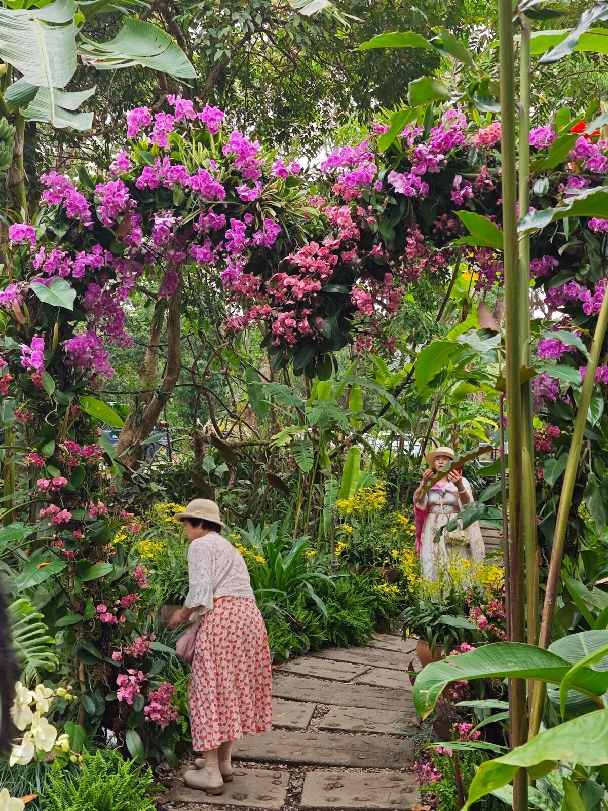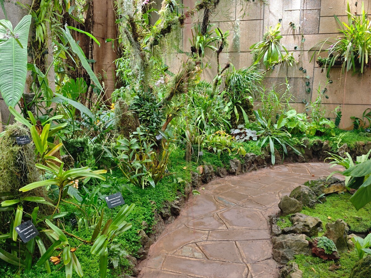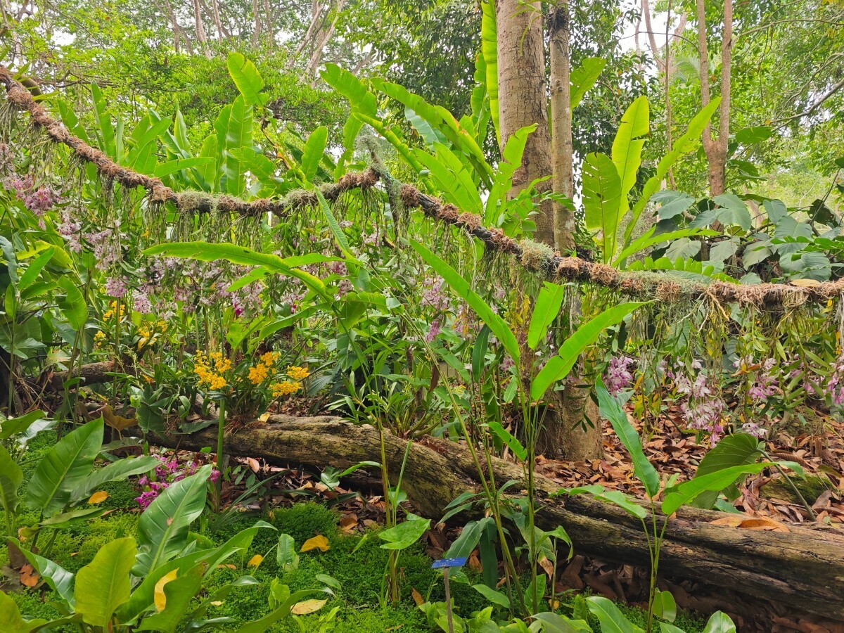 Glimpse of tropical orchids: A winding path through lush greenery showcases about 60 tropical orchid species, all set in a wild, rainforest-like habitat.·